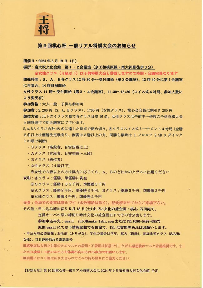 第9回棋心杯 一般リアル将棋大会 2024年5月19日(日) 参加者大募集!!