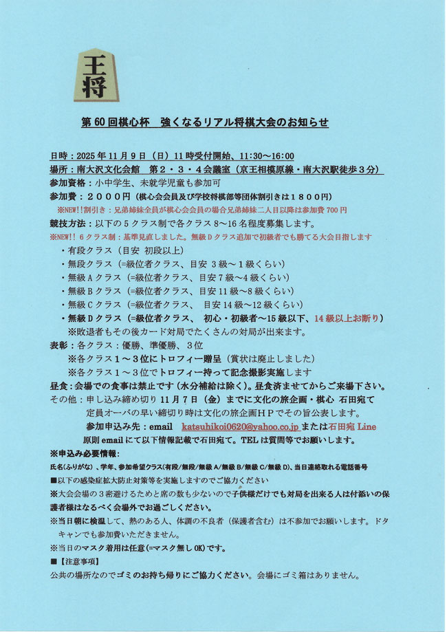 第60回棋心杯 強くなるリアル将棋大会11月9日(日) 参加者大募集!!