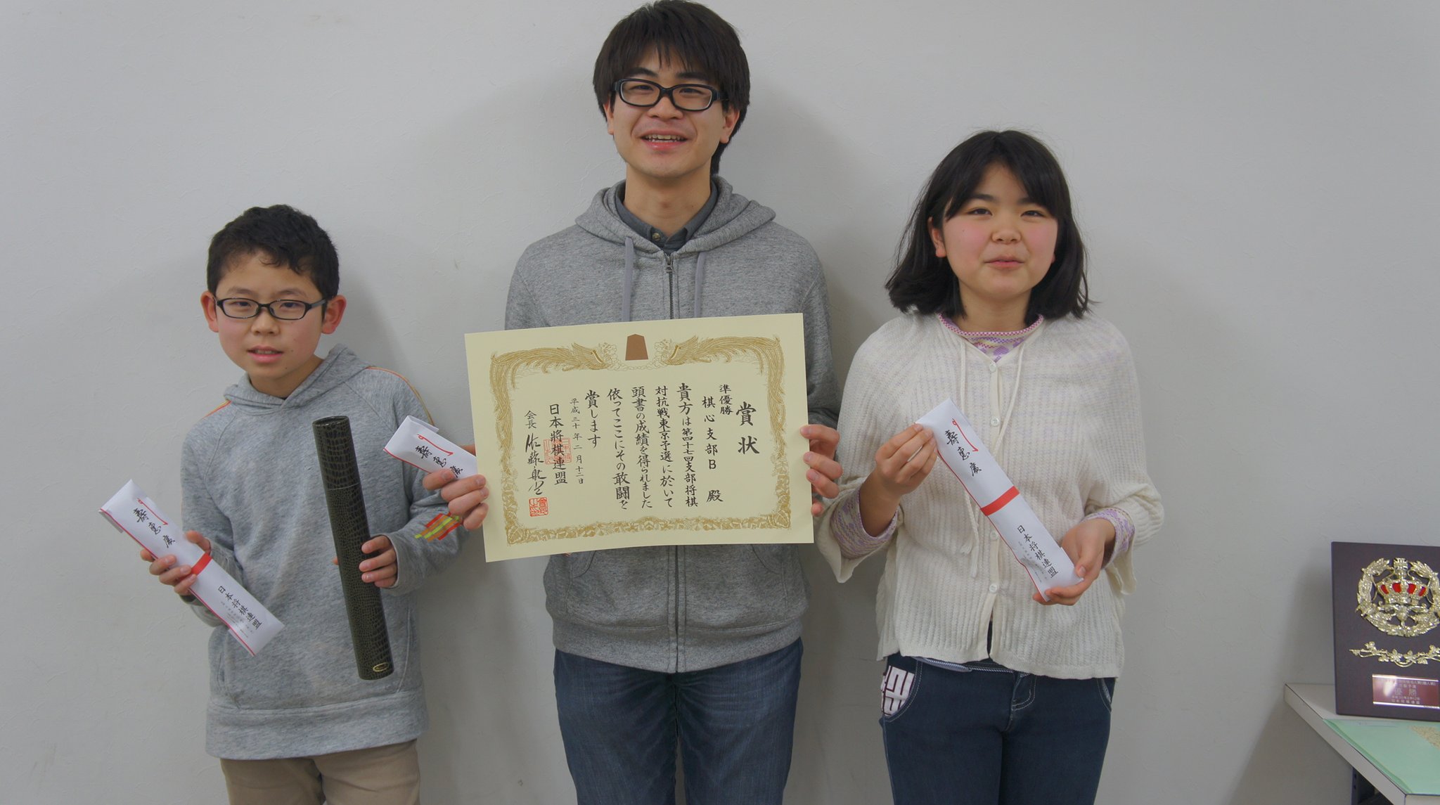 2019年は棋心支部は会員100人を超えたいわゆる100人支部の仲間入り(東京では2つめの100人支部)をしましたので、前年に戦った東京予選は免除で、東日本大会に代表を送り込むことができました。しかもその結果、東支部名人に棋心支部代表の知花賢氏(その後、知花氏は東西決戦にも勝利して初の全国タイトル、支部名人を獲得)、正式免状三段以下3人の団体戦である支部対抗戦では東日本3位入賞で参加3名(敬称略:山内梓、成清創、内山あや)は副賞の四段正式免状を獲得して団体戦は卒業となりました。